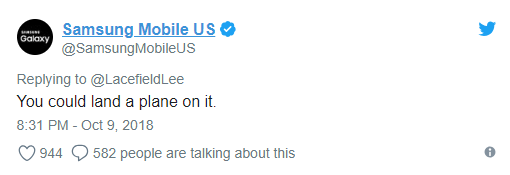 Samsung’s official US Tweeter account posted the following in response to Pixel 3 XL’s design: “You could land a plane on it”. To make things even worse, Samsung went on to give people the following advice: “If you like having more RAM, expandable storage, and living notch-free, we’ve got you #GalaxyNote9”.
